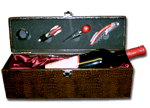 Alles perfekt arrangiert: Der edle Wein liegt in seinem Bett und wartet darauf, von Ihnen mit dem im Deckel der Weinkiste schon mitgelieferten Weinbesteck geöffnet zu werden. Ein Genuß für Auge und Gaumen.