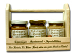Im dekorativen Tragehelfer aus Holz zusammengestellt finden Sie feinsten Thüringer Senf. Für jeden, der gern einmal etwas neues probieren möchte.